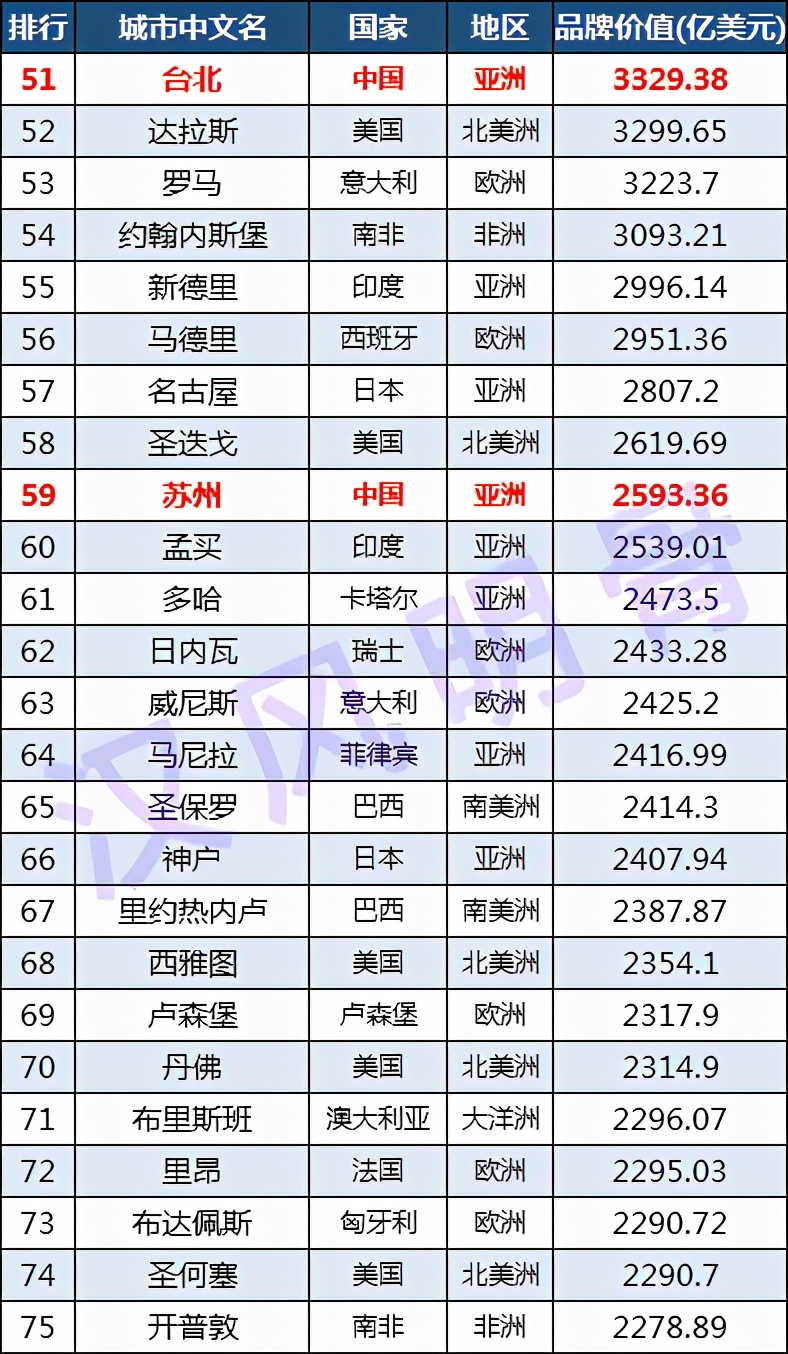 苏州排名第59,孟买排名第60,丹佛排名第70,开普敦排名第75;