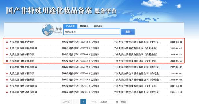 丸美股份丝蛋白修护系列产品的备案情况 图片来源:国产非特殊用途化妆品备案平台