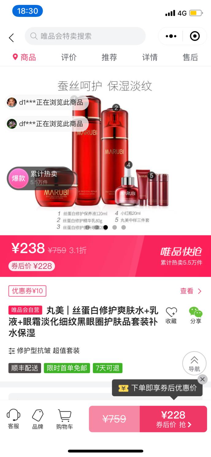 丸美股份丝蛋白修护系列产品在唯品会上的销售情况 图片来源:唯品会小程序
