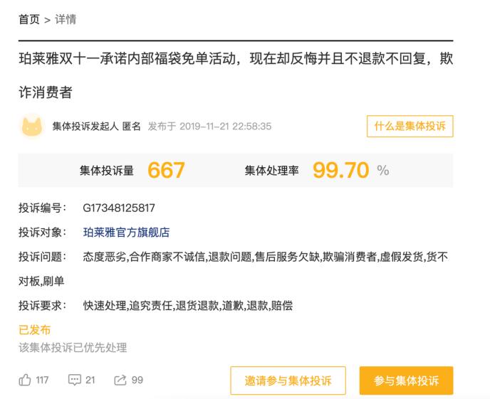 2019年11月21日,一名匿名用户在黑猫投诉上发起了一次对珀莱雅双11福袋活动的集体投诉,最近一条跟进的投诉日期为2021年2月19日,截至3月12日,已有667名用户参与了这次集体投诉。
