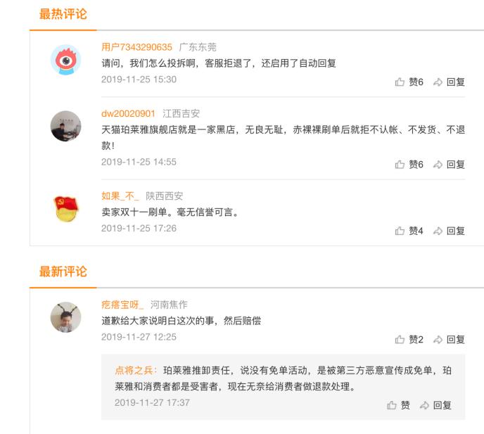 珀莱雅双11福袋免单活动遭遇的集体投诉情况及用户对此事件的部分评论