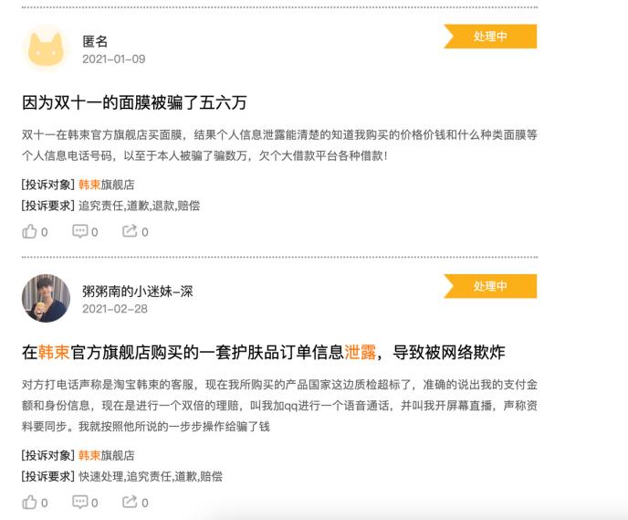 消费者对韩束疑泄露个人信息的相关投诉 图片来源:黑猫投诉