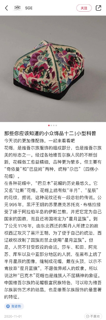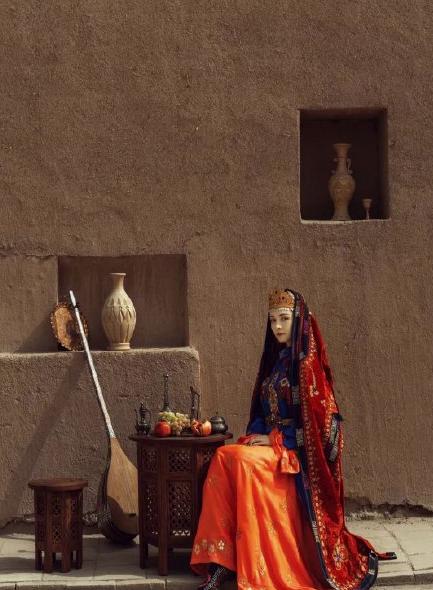 艾德莱斯是新疆的一种传统丝绸,花纹华丽、花色繁多,近年来这种具有浓郁新疆韵味的丝绸也被用于设计现代服饰,古老的美丽花纹融入现代生活的潮流。花帽是维吾尔族服饰的组成部分,也以繁复的花纹散发精致的古典美丽。