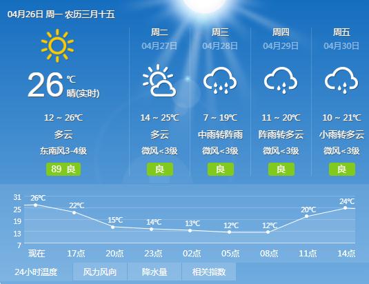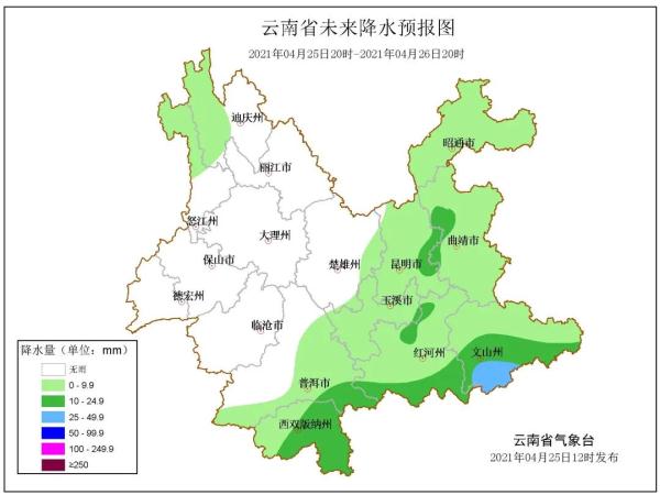 预计26-28日,滇中及以东以南地区有降水过程并伴随局地强对流天气,未来24小时:文山南部、红河南部、普洱东南部、西双版纳东部阴有中雨局部大雨,昭通、曲靖、昆明、楚雄东部、玉溪、文山北部、红河北部、普洱西南部、西双版纳西部阴天间多云有小雨局部中雨,迪庆西部、怒江北部多云有阵雨,其它地区多云间晴。