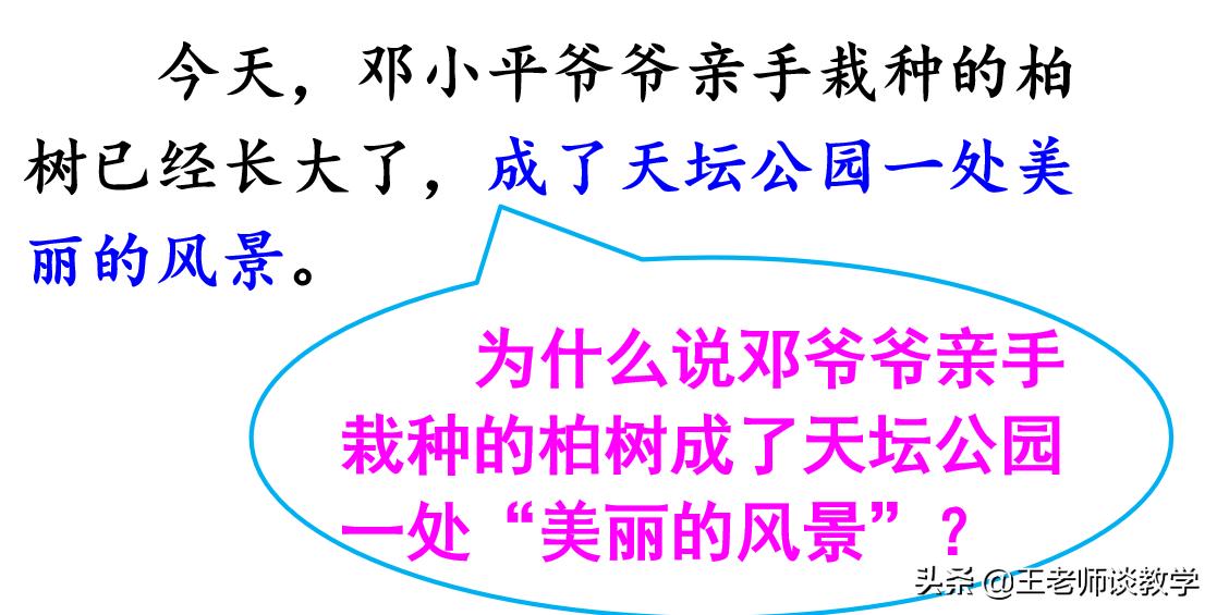 “美丽的风景”,一是指树长得茂盛、漂亮;二是因为这棵树是邓爷爷栽种的,邓爷爷为我们做了好榜样,所以很多人去参观这棵树。