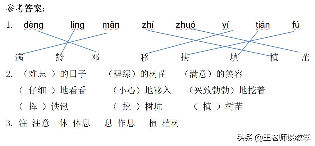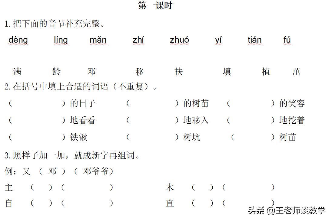 3、邓爷爷是怎样植树的?(挖土、选树苗、填树坑、扶正)