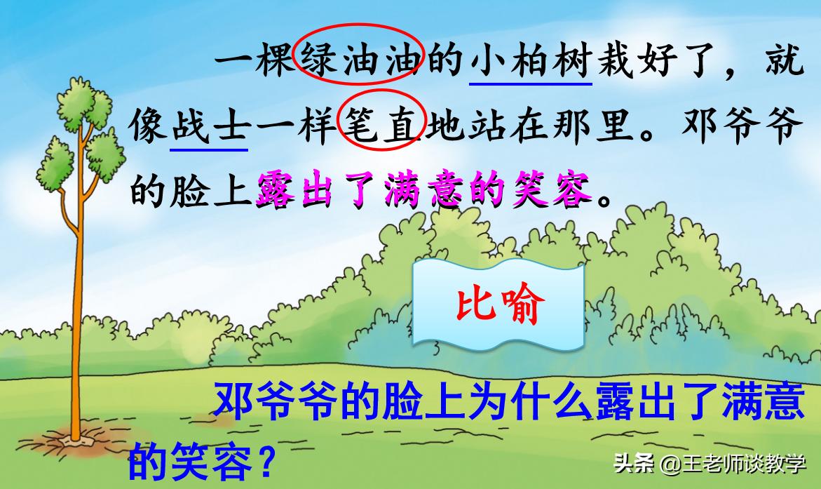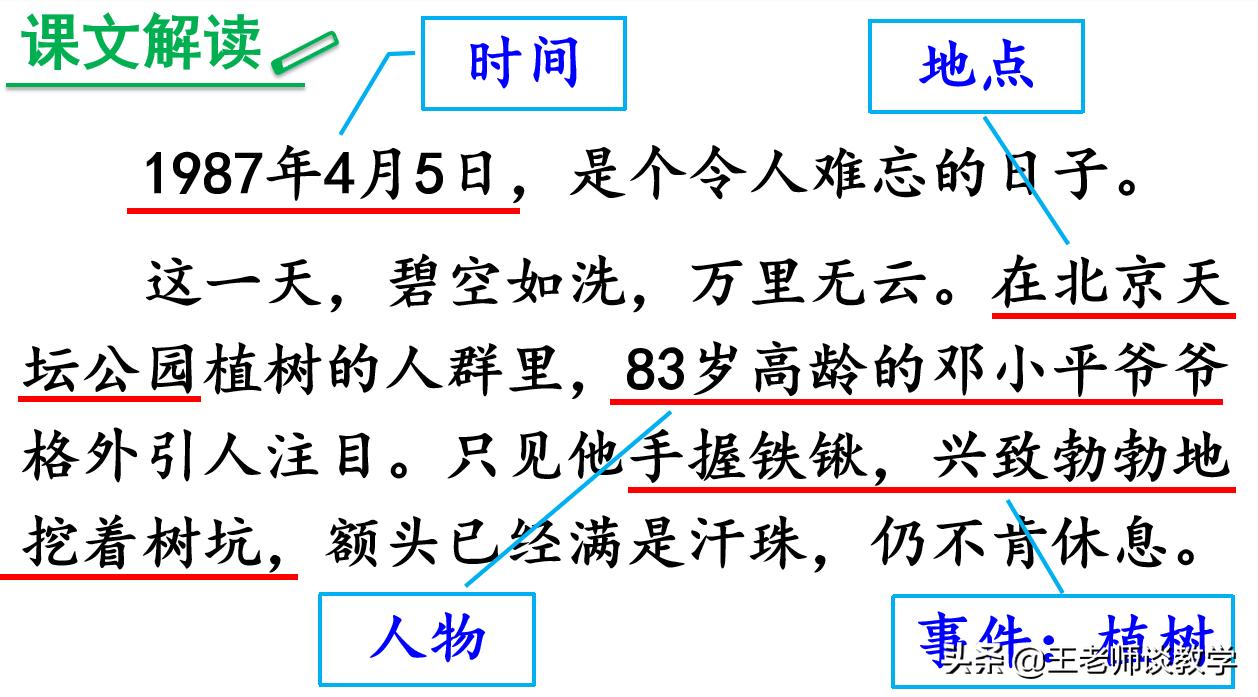 本课重点写邓小平爷爷植树的经过。通过朗读课文,体会邓小平爷爷植树的认真态度和绿化祖国的心愿。同时也让孩子们初步了解植树的意义,有植树绿化和保护环境的意识。