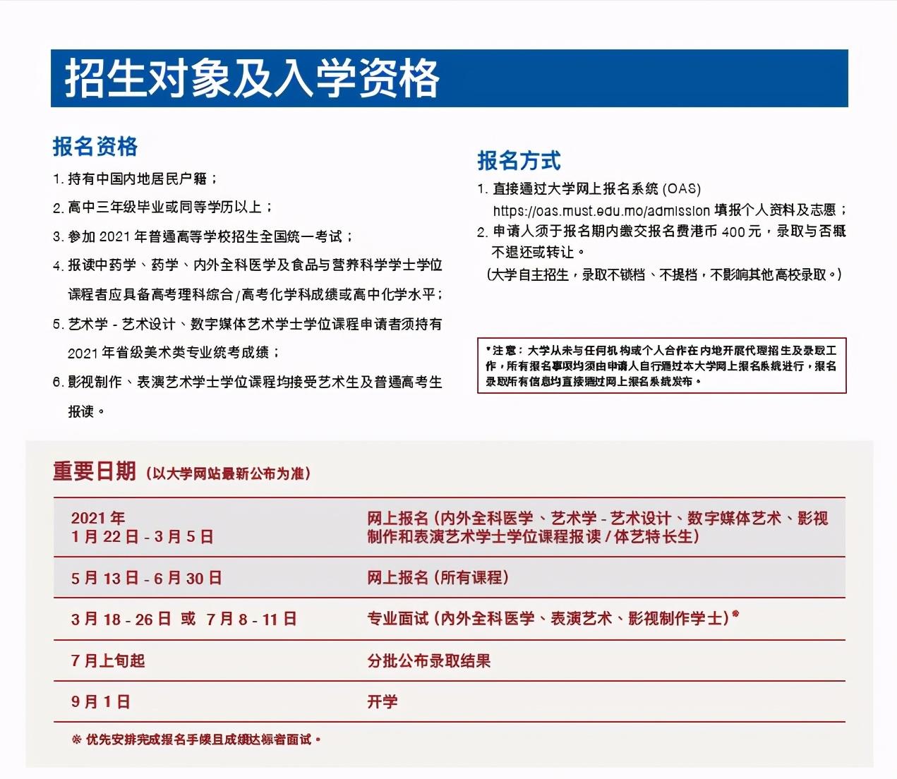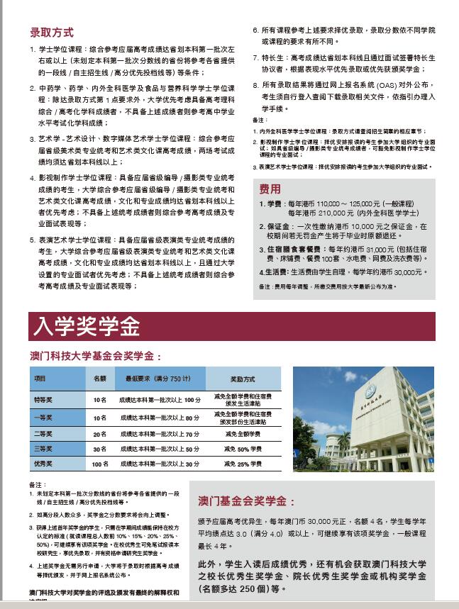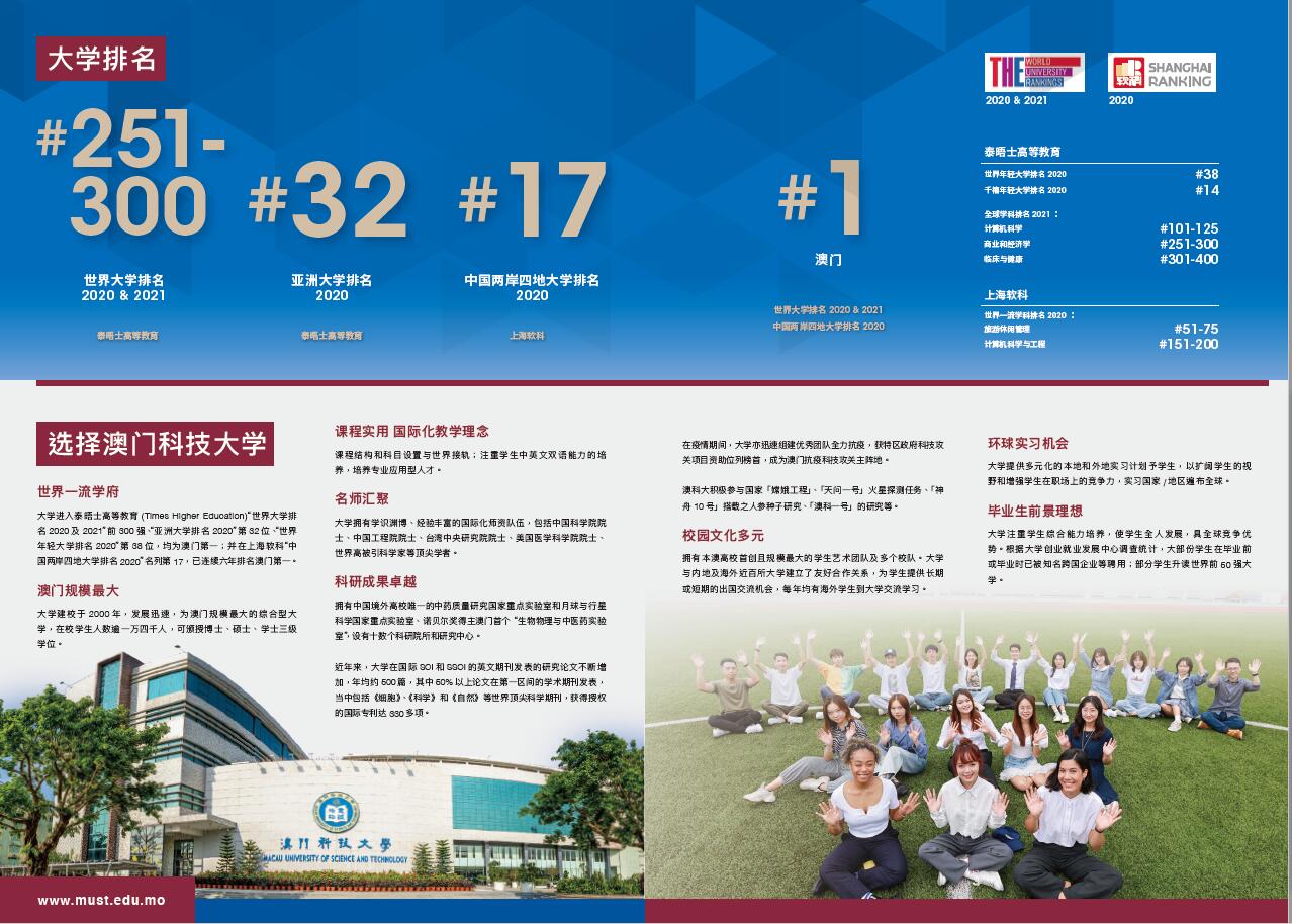 澳门科技大学拥有博士、硕士、学士三级学位授予权,经中国教育部批准面向内地招生 ,设有10个学院,授课语言以英语为主,部分课程以中、葡或西班牙语授课。