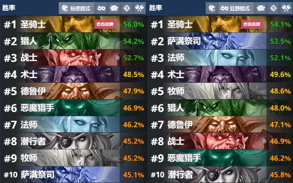 我们来看看截止到发稿前的标准和狂野天梯职业胜率,圣骑统治两个模式,真不愧是“一骑绝尘”!