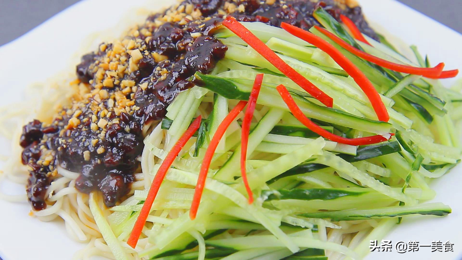 把面条放在盘中,撒上黄瓜丝,浇上面酱,最后撒上花生碎和红椒丝作为点缀,更加好看也更加好吃。