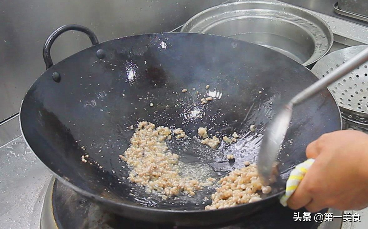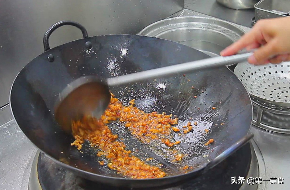 锅中烧油,放入五花肉末,煸香煸透,煸炒出猪油,放入姜末,蒜末,煸炒出香味。