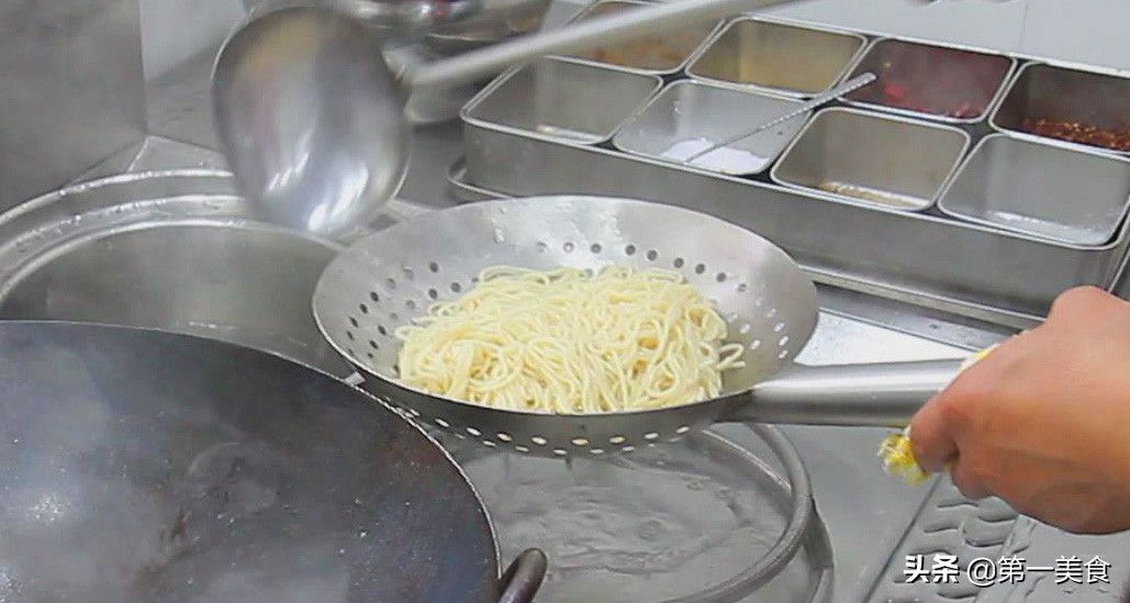 水开后,下入面条,等到面条飘起来,颜色泛黄,即可捞出,面条不要煮的时间太长,刚刚熟就要捞出,煮的时间太长,以免影响口感。