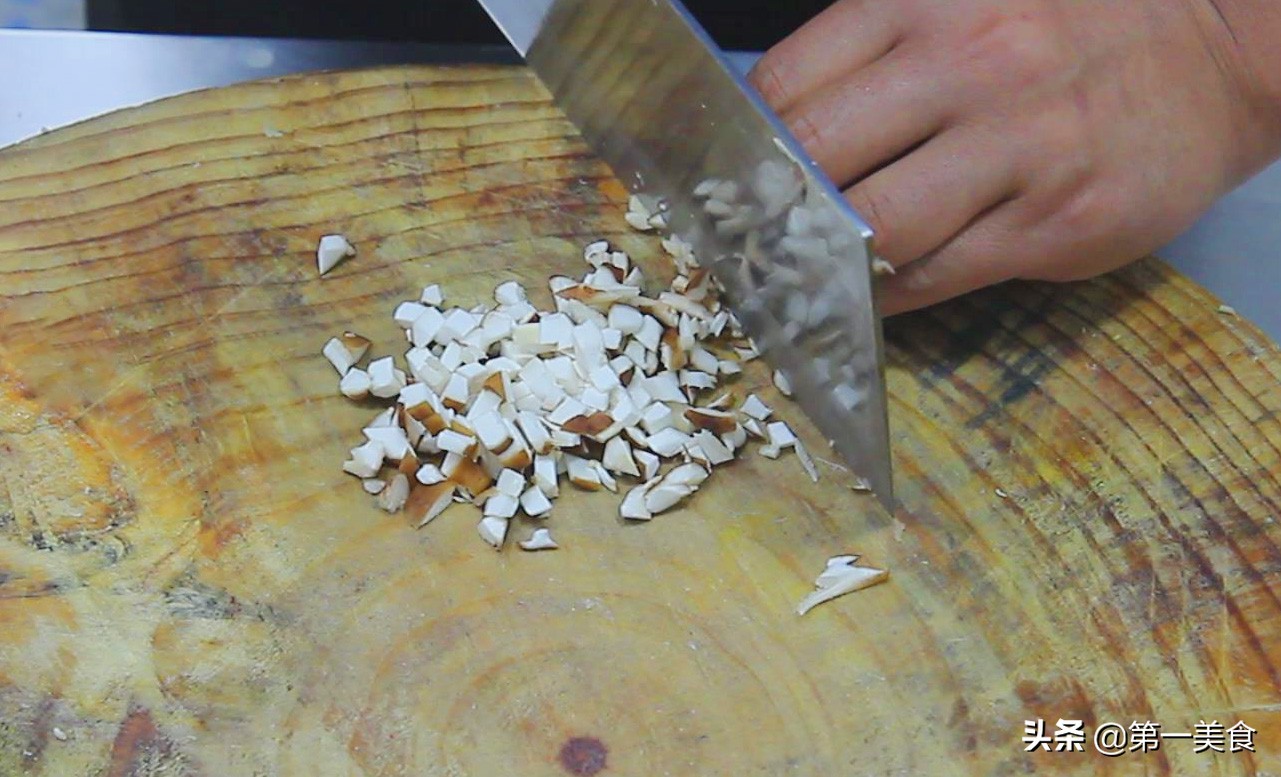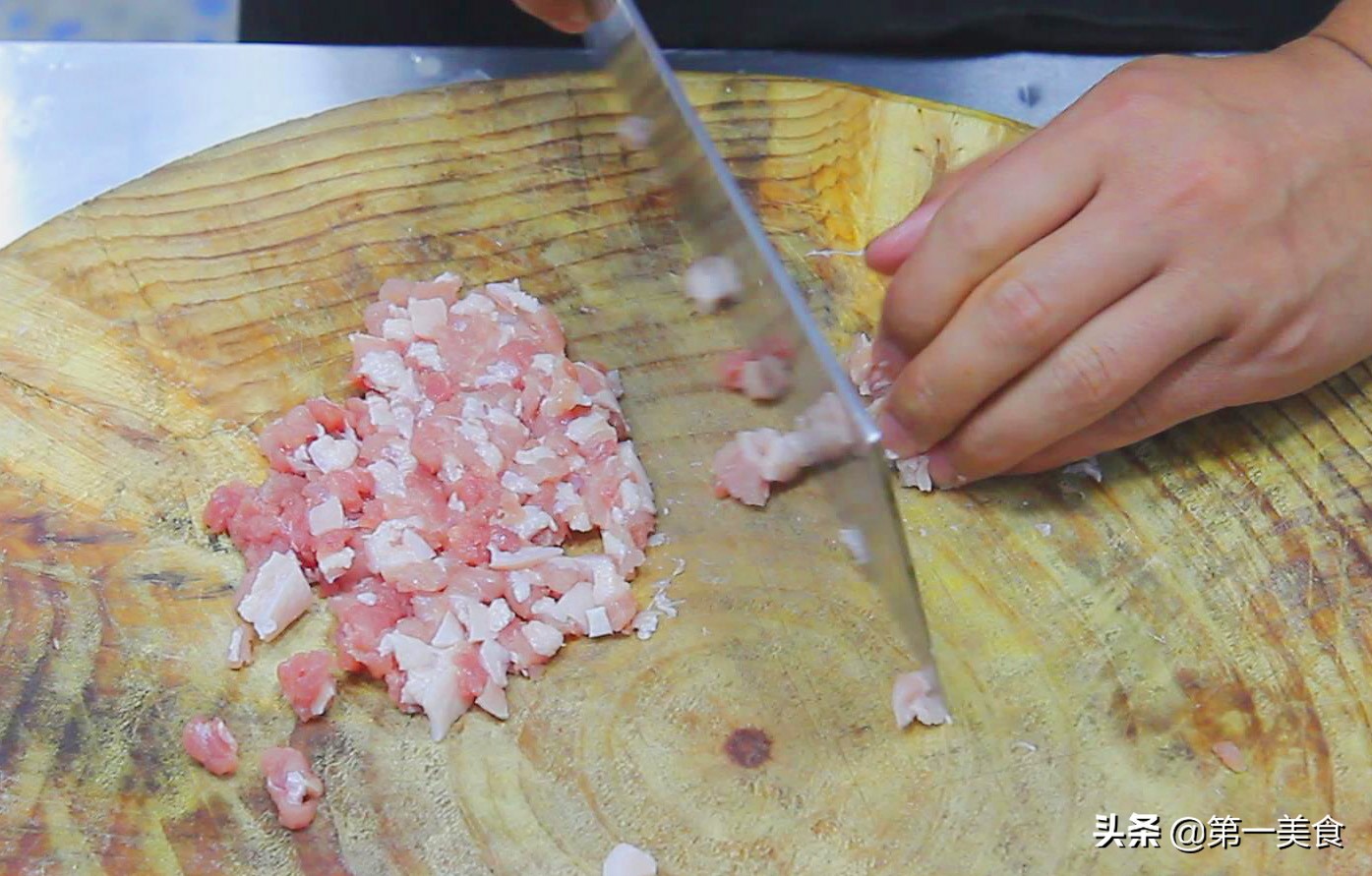 五花肉100克,先切成细丝,再改刀切成小肉粒,剁碎备用。