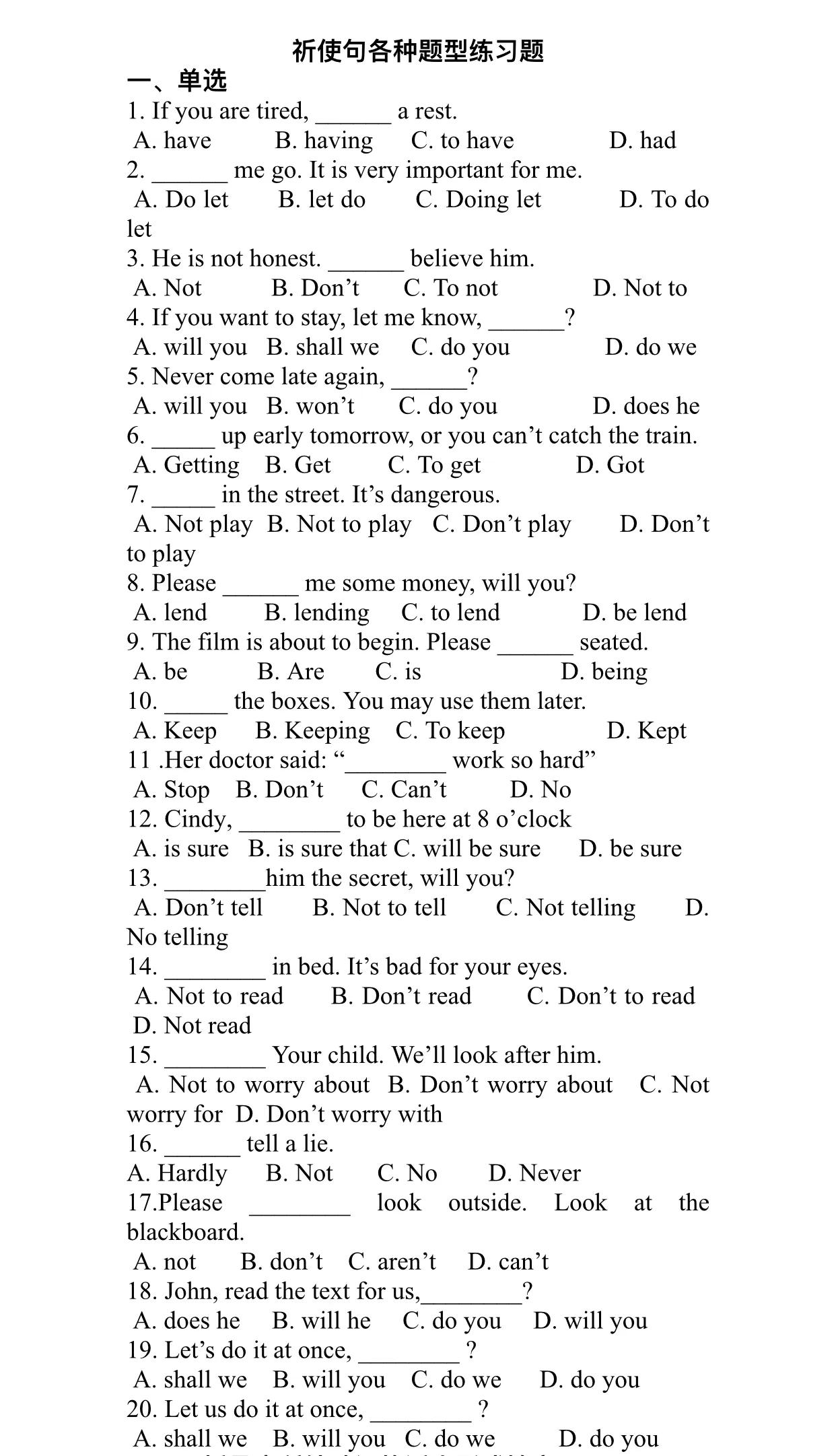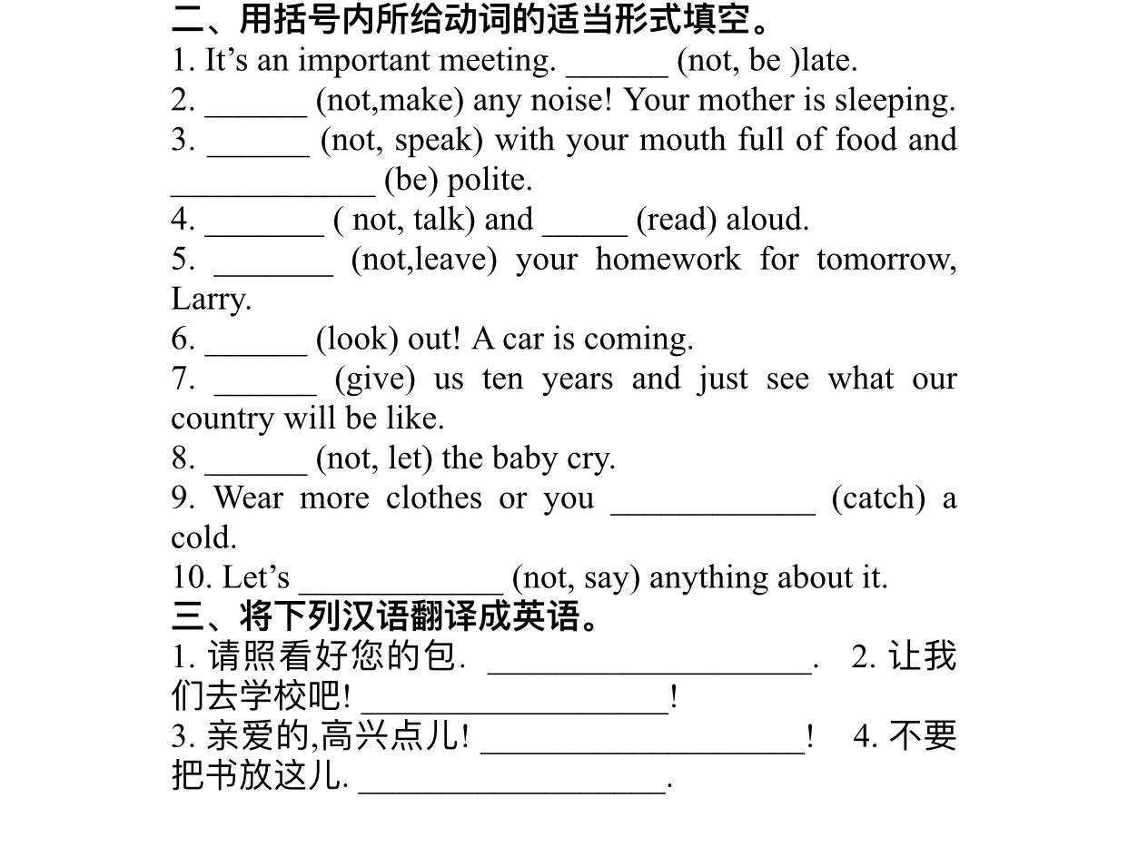 句式特征:尤其是无主语,但也是句子,因为只是没有主语,谓语动词都有,即Be quiet.还是Don&39;t throw everywhere.也就是说这些祈使句只需要补充一个主语就是一个完整的句子。