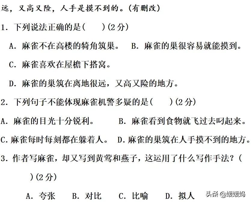 《猫》考查对课文的理解能力,常以填空、选择的形式对猫的特点进行考查。