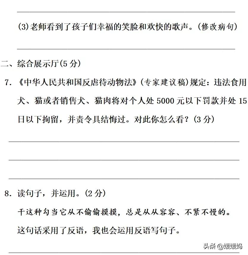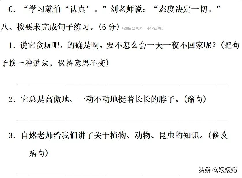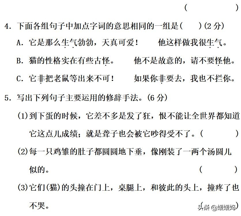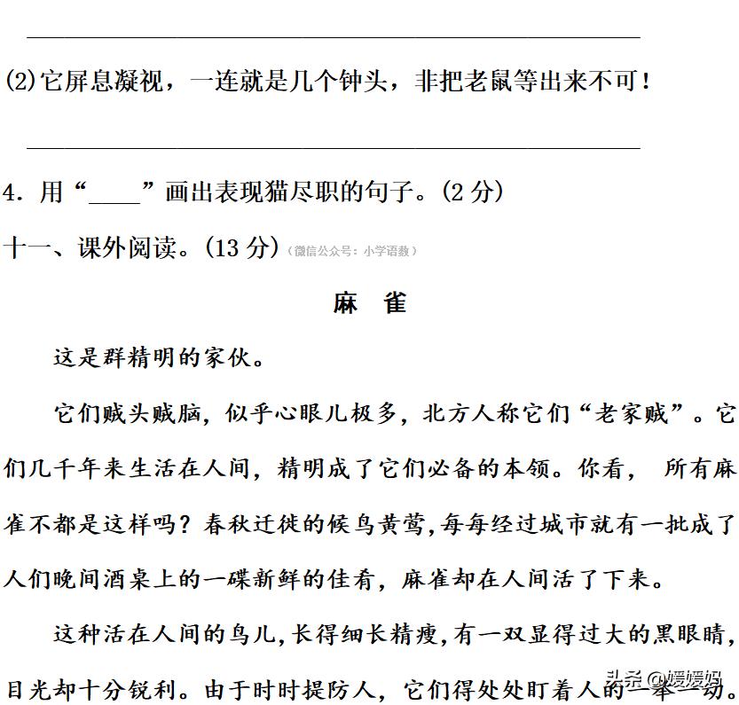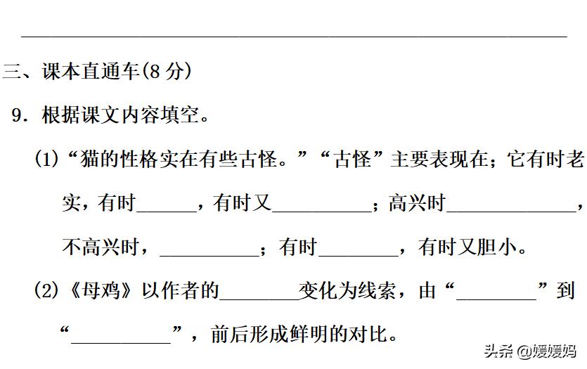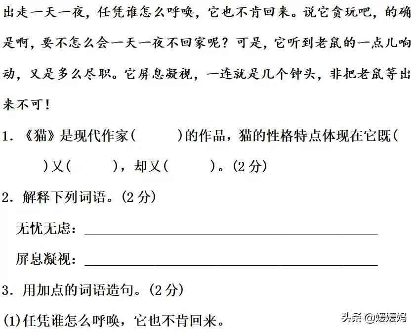 《猫》经常考查课文的背写能力,以按原文填空的形式对课文内容进行考查。