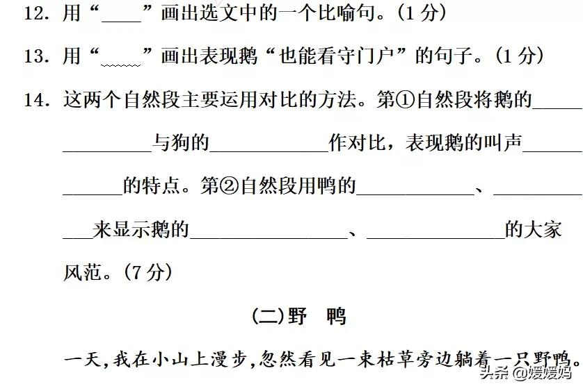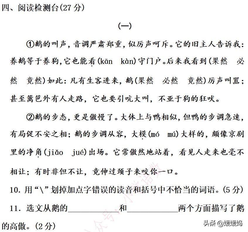 12.鹅的步调从容,大模大样的,颇像京剧里的净角出场。
