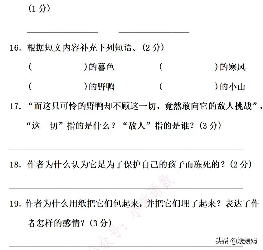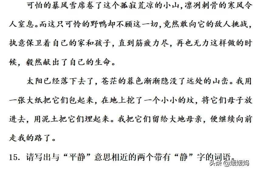 19.因为野鸭这种伟大的母爱让作者感动,所以作者把它们包起来,并把它们埋了起来。表达了作者对野鸭的敬佩、赞美之情。