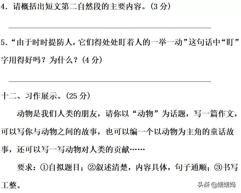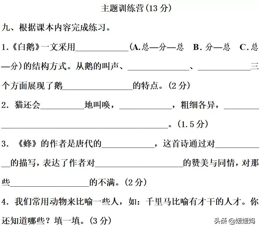 本单元这三篇文章都是通过描写动物的特点,用具体事例来表达作者的情感,以激发我们保护动物,与大自然和谐共处的情感。这部分内容经常以填空、问答、阅读的形式考查。