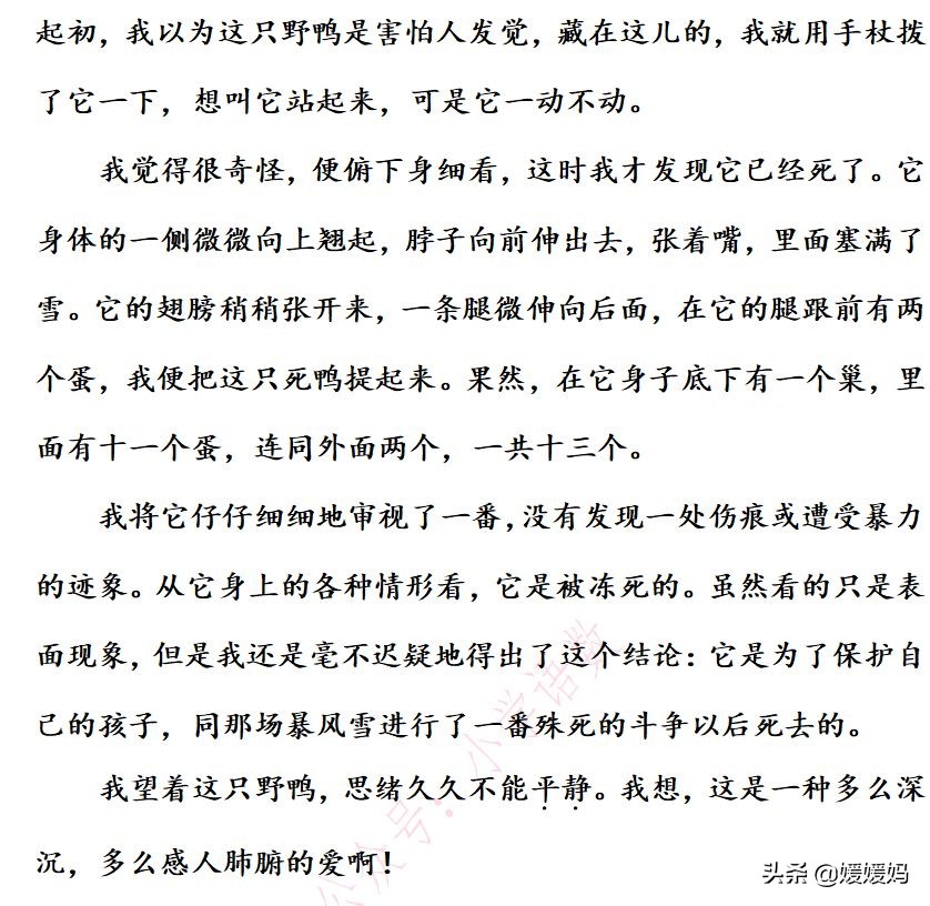 18.从它死去时的姿势及在它身下发现的蛋可以推测出它是为了保护自己的孩子而冻死的。