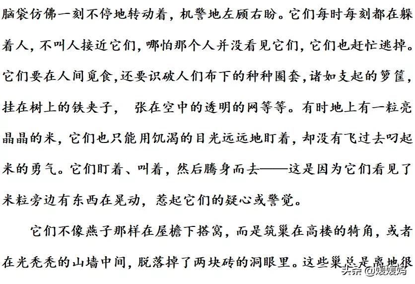 一只鸟儿飞过,或是什么东西响了一声,它立刻警戒起来:歪着头听;挺着身儿预备作战;看看前,看看后,咕咕地警告鸡雏要马上集合到它身边来。