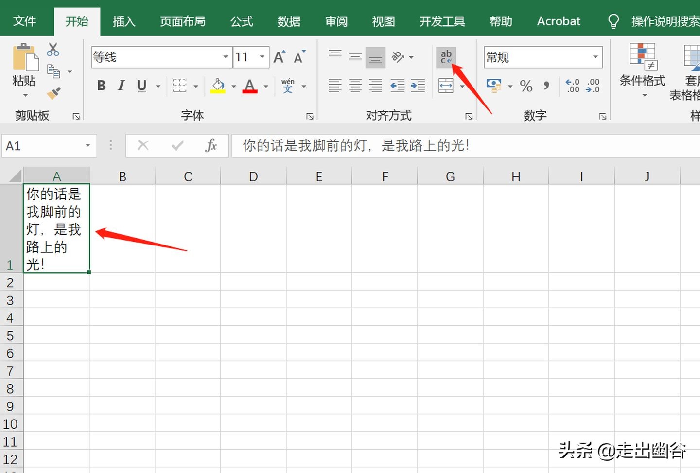 2. 要使上面的文字进行自动换行,在“开始”选项卡下找到换行的图标并点击它。