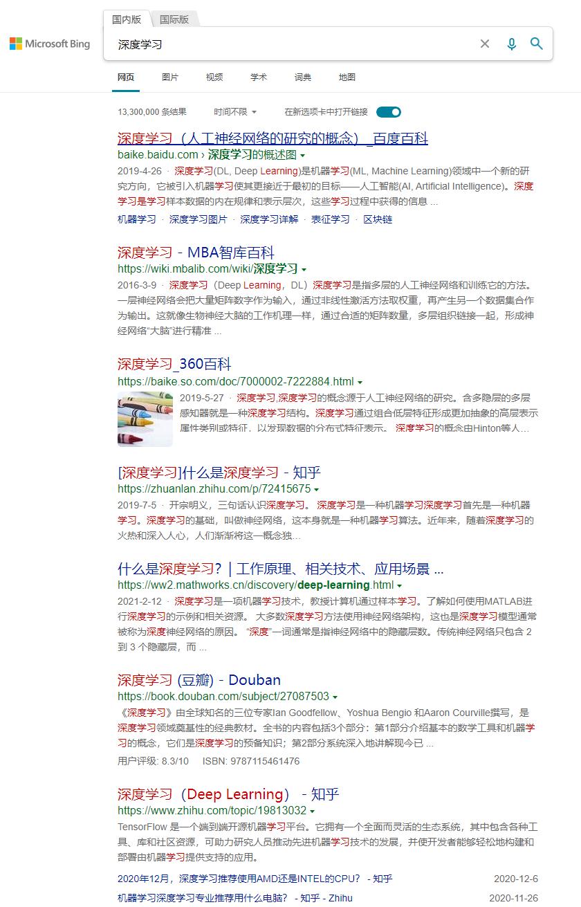 微软的bing搜索引擎支持国内版和国际版,首先用国内版对‘深度学习’关键字进行搜索。
