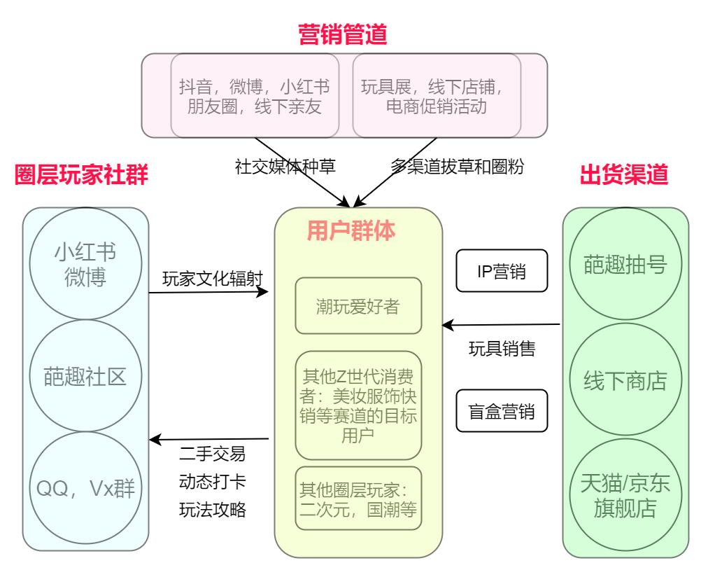 从近十年的产业发展来看,一方面,潮玩的销售商和厂家逐渐从IP化中尝到了甜头,让一些有一定认同度的IP与玩具结合,让产品除了原有渠道可以借助第三方的IP渠道得以宣传和销售。同时IP自有的流量和收藏价值也为玩具的溢价带来更多的可能性和玩法。另一方面,以泡泡玛特为代表的的玩家发现了盲盒模式所带来的高复购率和高单次购买额的特点,开始从SKU整合,第三方社交媒体的社群种草链路搭建等维度,开启了潮玩盲盒的产品模式。目前,已经逐步形成极具经济和流量价值的潮玩圈层生态。