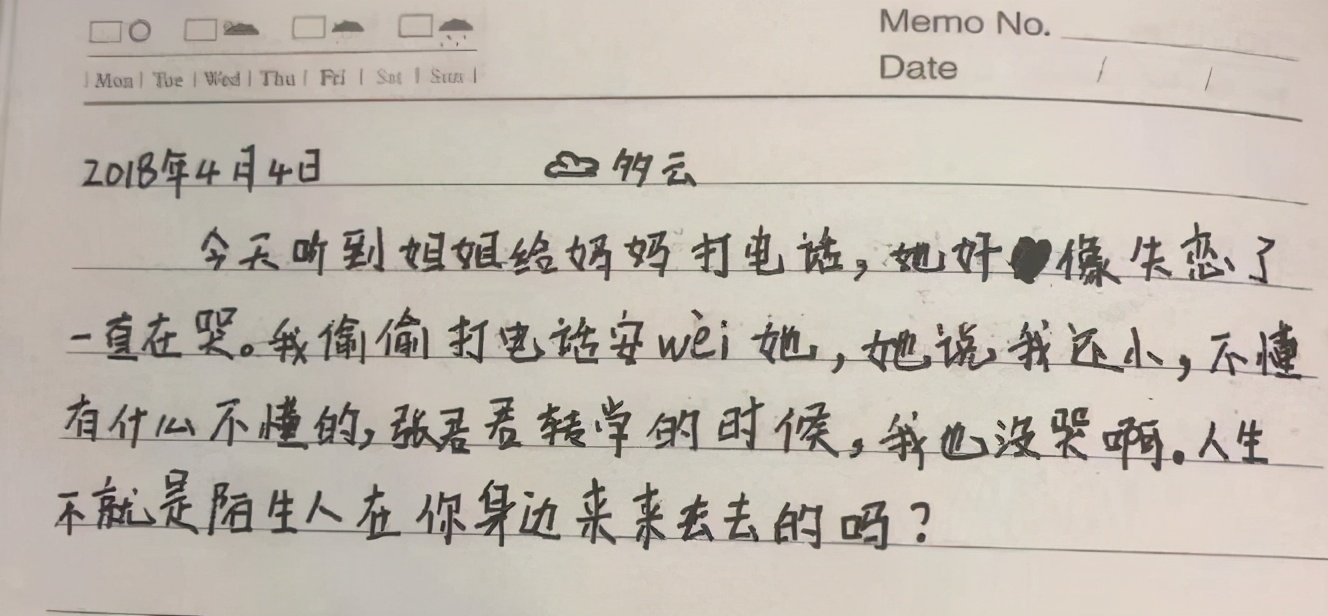 日记的内容是姐姐失恋了,本来自己想安慰,没想到姐姐却说小孩子不懂,她用日记写出了自己感同身受的例子,自己其实是可以理解这种“失恋”经历的。