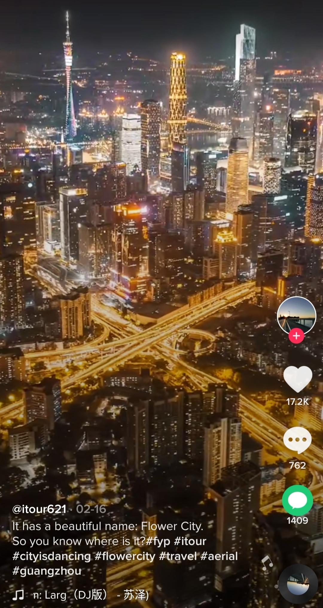 提到与广州有关的短视频,城市夜景是其中不可或缺的内容之一。航拍视角下,街道上车水马龙,楼宇间霓虹闪烁……灯光留下的绚烂轨迹中,国际化大都市的繁华跃然屏上。以创作者@itour621今年2月上传的视频为例,摩登现代的广州在夜色映衬下宛如特效画面。视频下方,@itour621还特意留了一个悬念:“这是一座被称为‘花城’的城市,你知道它在哪吗?”
