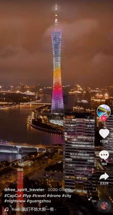 在一众航拍镜头中,广州塔凭借着“小蛮腰”的造型脱颖而出。无论是远距离全景,还是顶部特写,各有各的精彩。目前,仅“广州塔”话题下视频播放量就达300万人次,成为TikTok上广州城里最热门的网红。