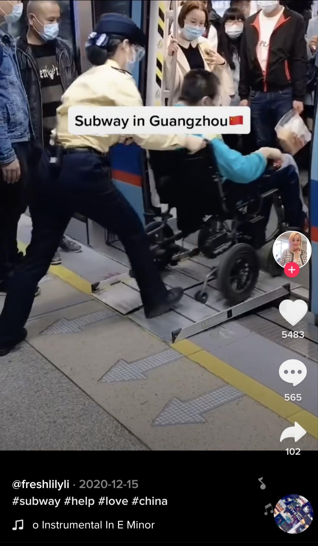 而在摩登、现代之外,创作者@freshlilyli的作品则呈现了广州温情的一面。视频中,广州地铁的工作人员在地铁进站后,耐心等着下车乘客一一离开,然后拿出来踏板放在地上,一名乘轮椅出门的乘客因此得以平稳上车。整个过程中,周围乘客也都耐心等待着,并早早让开了轮椅将要经过的路线。