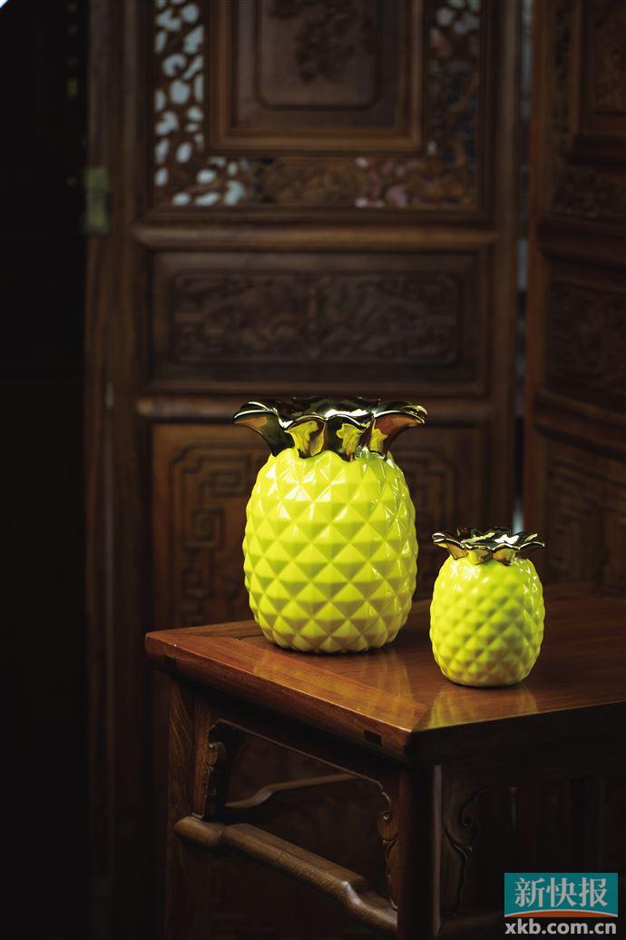 作品腹部以柠檬黄釉为底色,顶端的叶子饰以金色,两种釉色结合在一起,敞亮和谐,釉色艳丽,璀璨明亮,陈设在案,光耀一室。作品以具象为基础,阐发意象,结合当代艺术的理念,巧妙地兼顾诗意追求与写实元素,造型简单却给人美不胜收的视觉效果,让人充满了惊喜与悸动。正如粤语的含义一样,确是一件充满生活美学的“宝贝”。
