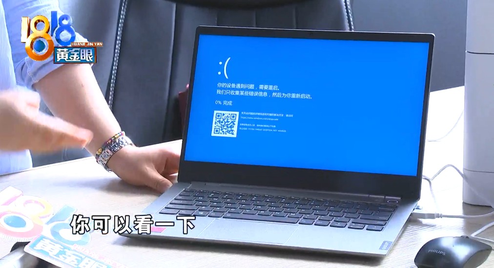 郑女士:“我的电脑只要连上这根数据线,它马上就蓝屏死机了,你可以看一下 ,屏幕变蓝屏就是这样子。”