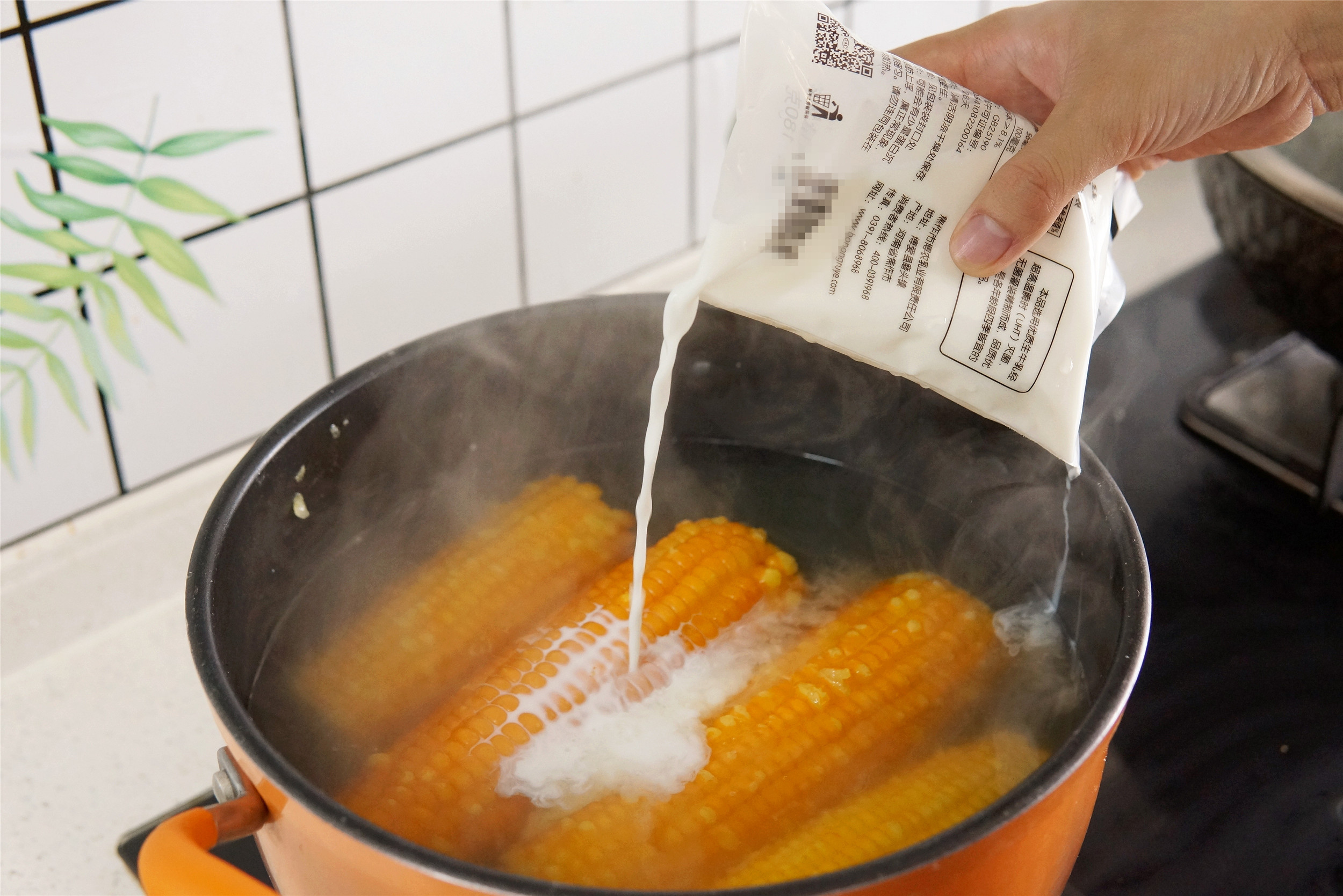 3、待煮开后,锅中倒入1袋牛奶,想味道更加香甜,可以选择加入一些白糖和黄油,盖上锅盖煮沸后,转小火继续煮10到15分钟,盖上锅盖焖上半个小时让奶香味渗入其中,口感香甜又软糯的煮玉米就完成了。