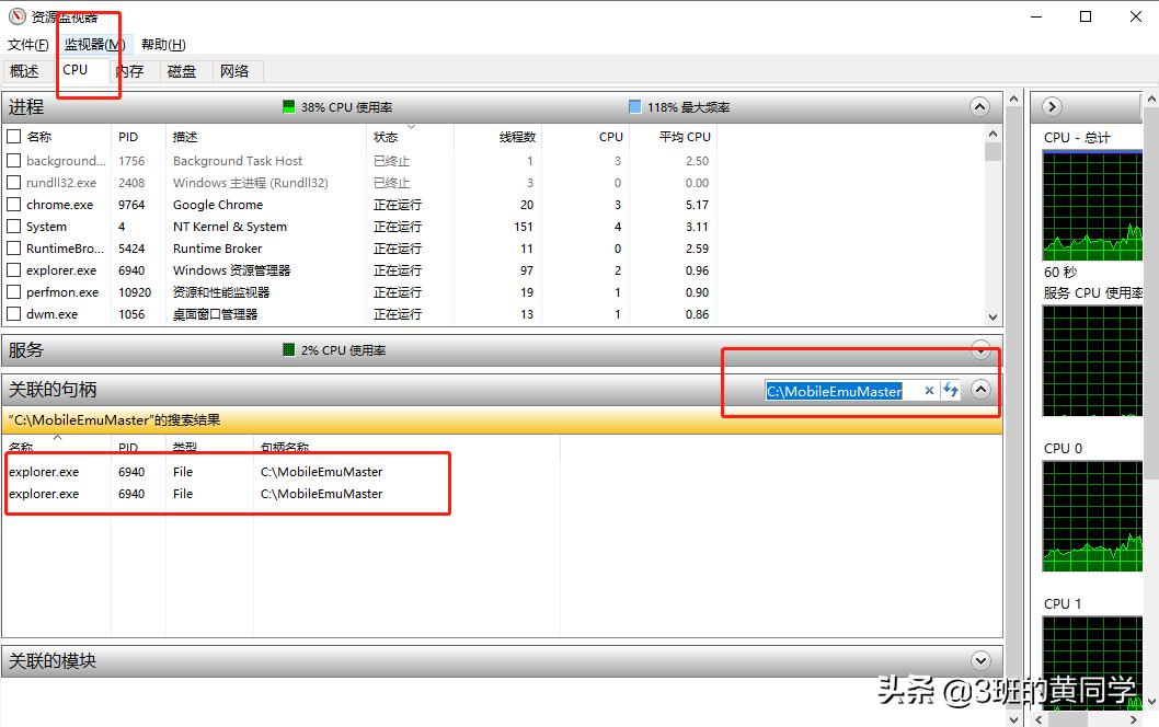 在“资源监视器”,点击“CPU”找到“关联的句柄”,在右边的搜索句柄输入文件或者文件夹的路径,如下图