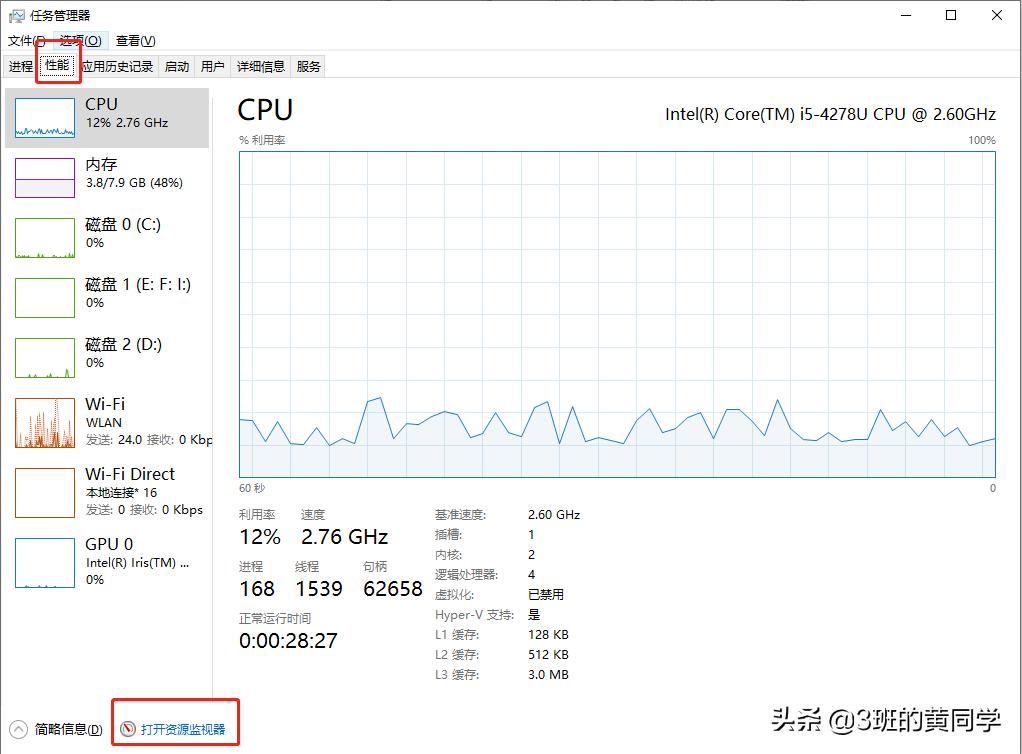 “任务管理器”选择“性能”,点击底部的“打开资源监视器”,如下图