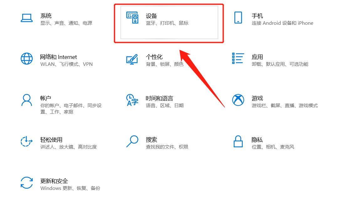 进入系统设置界面以后,点击“设备”选项。如下图: