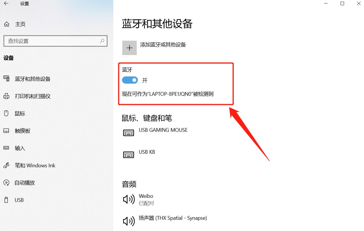 此时电脑的蓝牙设备开始搜索附近的其他蓝牙设备,而电脑的蓝牙开关也打开了,可以被其他设备搜索,也可以搜索其他设备。此时我们打开蓝牙耳机,有些蓝牙耳机开启后默认“被搜索功能”,有一些蓝牙耳机可以主动搜索附近的蓝牙设备。但一般情况下,都是蓝牙耳机开启后处于“被搜索”的状态,此时电脑就会搜索到蓝牙耳机。如下图: