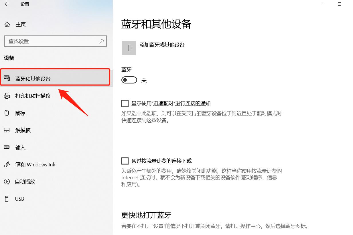 进入设备选项以后,单击左侧的“蓝牙和其他设备”选项。如下图: