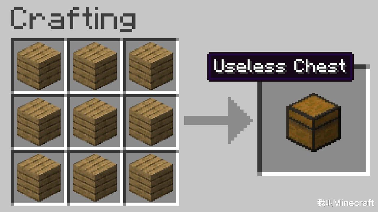 7、没用的箱子;由9块木板合成的一个箱子,(正常的箱子为8块木板)。按照合成逻辑来说,这个箱子理论上是实心的。所以得出结论,这是一个完全没什么的用的箱子。或许可以逆向分解出9块木板?