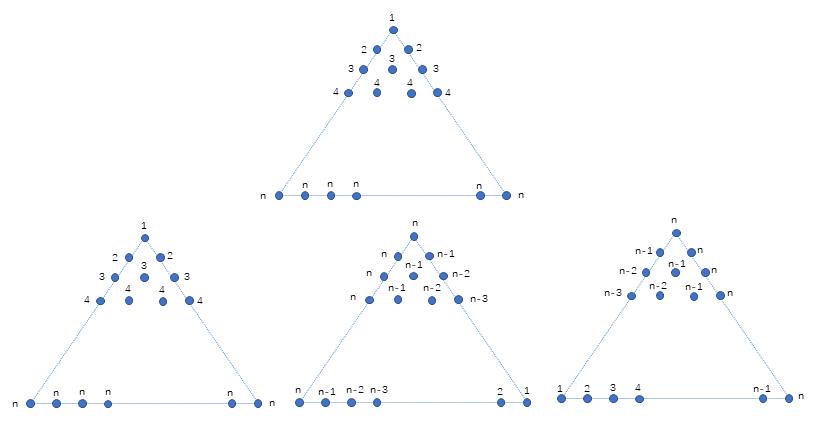 最上方的三角形每一行求和依次为,...,因此所有点上数字求和即为待求结果,记为S。为了求得结果,将最上方三角形旋转3次,也就是上图中下面的三个三角形,很容易能看出,三个三角形同位置3个点的求和均为2n+1,每个三角形拥有的位置数为