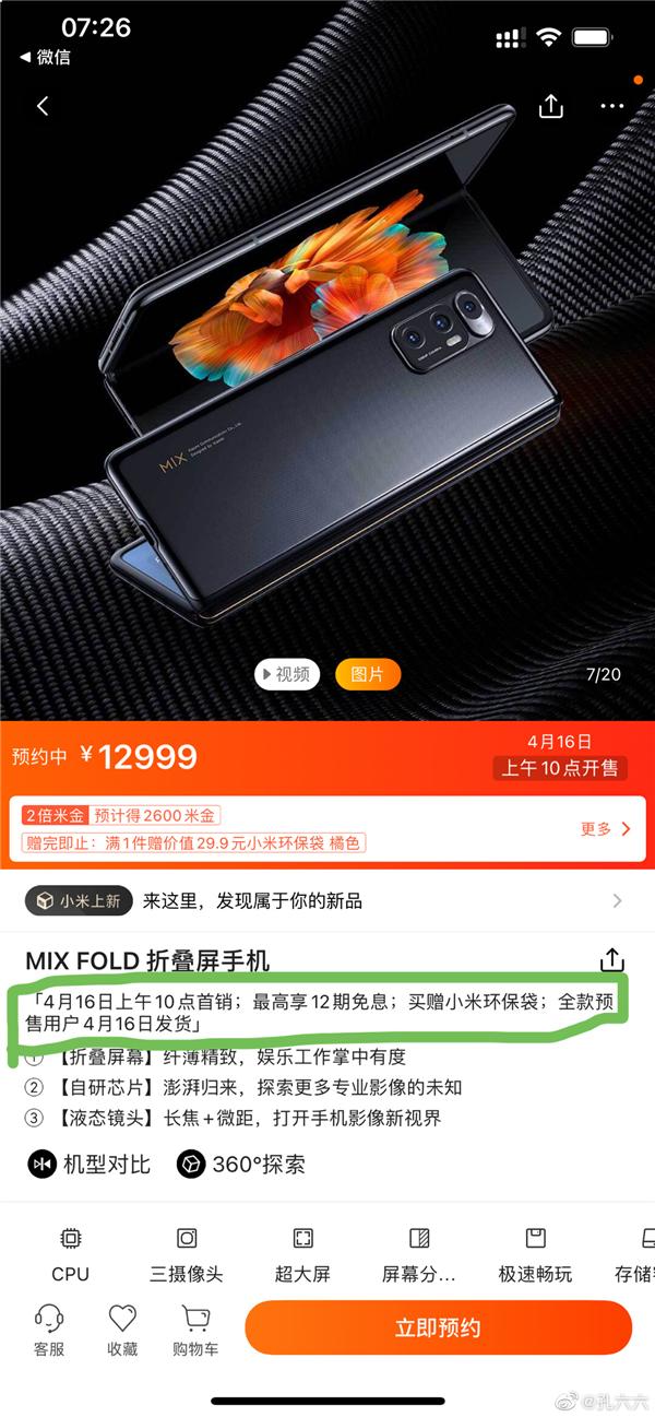 4月15日消息,小米MIX Fold将于明天正式首销,售价9999元起。
