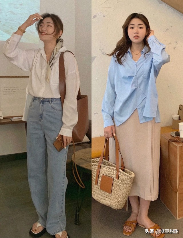 前面这位小姐姐就将露肤这个小技巧用得很好。左边用宽松白衬衫搭配牛仔裤,塞衣角修饰比例。解开扣子打造V领,露出锁骨更显瘦有魅力;右边V领衬衫配半裙,露出锁骨和脚踝,轻松穿出好身材。