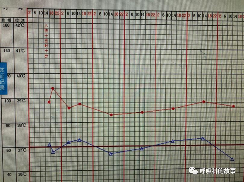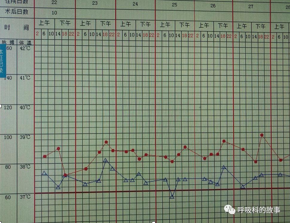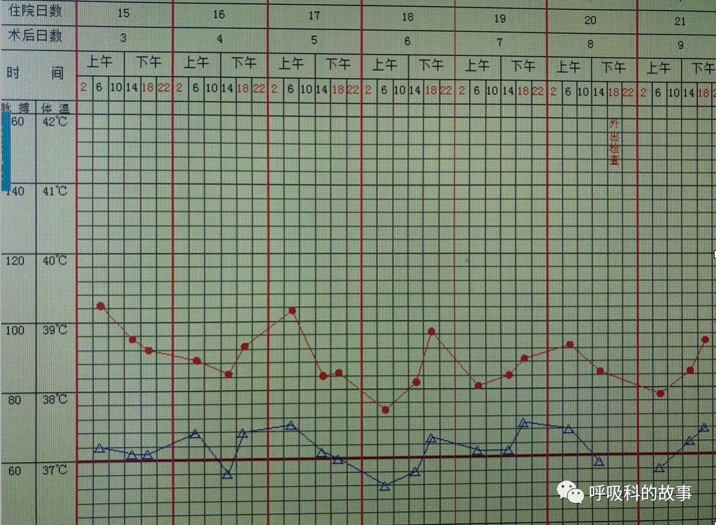 因此在后续几天里,连续给予患者补充红细胞以及将低分子肝素减量乃至停用后,患者的气短症状又逐渐得到缓解,从体温单上可以看到,后来即使出现低热,脉搏也基本上没有超过100次/分。