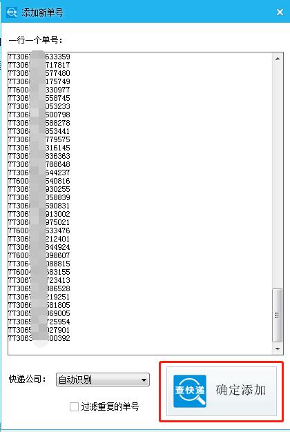 第三步:将快递单号提前准备好,不同的快递可粘贴到一个表格内,然后全选复制,粘贴到工具的空白处即可,最后点击工具右下角的【确定添加】。