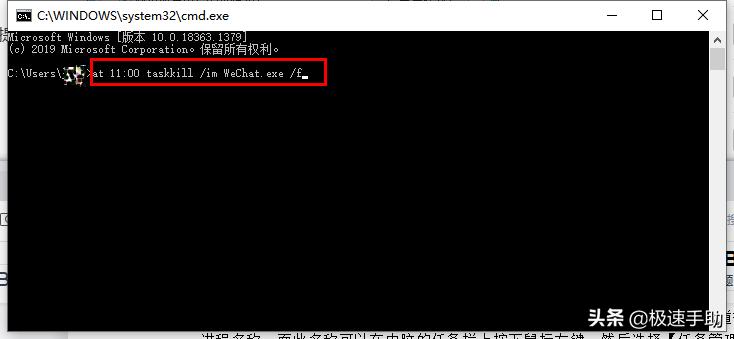 第四步,然后我们在系统弹出的【命令提示符】窗口中,输入【at 11:00 taskkill /im WeChat.exe /f】,然后按下回车键即可。这里的“taskkill”是结束指定进程的命令,而“/im 进程名”是指定要终止的进程名,“/f”则是强制终止进程。