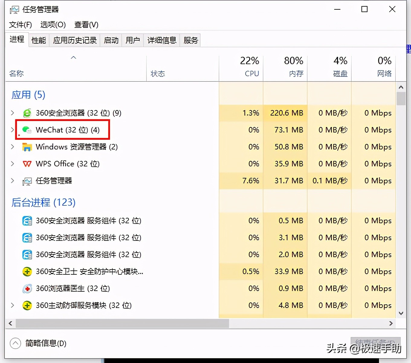 第三步,如果我们想要在11点的时间里,关闭微信程序的话,首先我们得知道微信程序的进程名称,而此名称可以在电脑的任务栏上按下鼠标右键,然后选择【任务管理器】功能。接着在Windows任务管理器的界面中,找到微信进程,查看进程的名字。