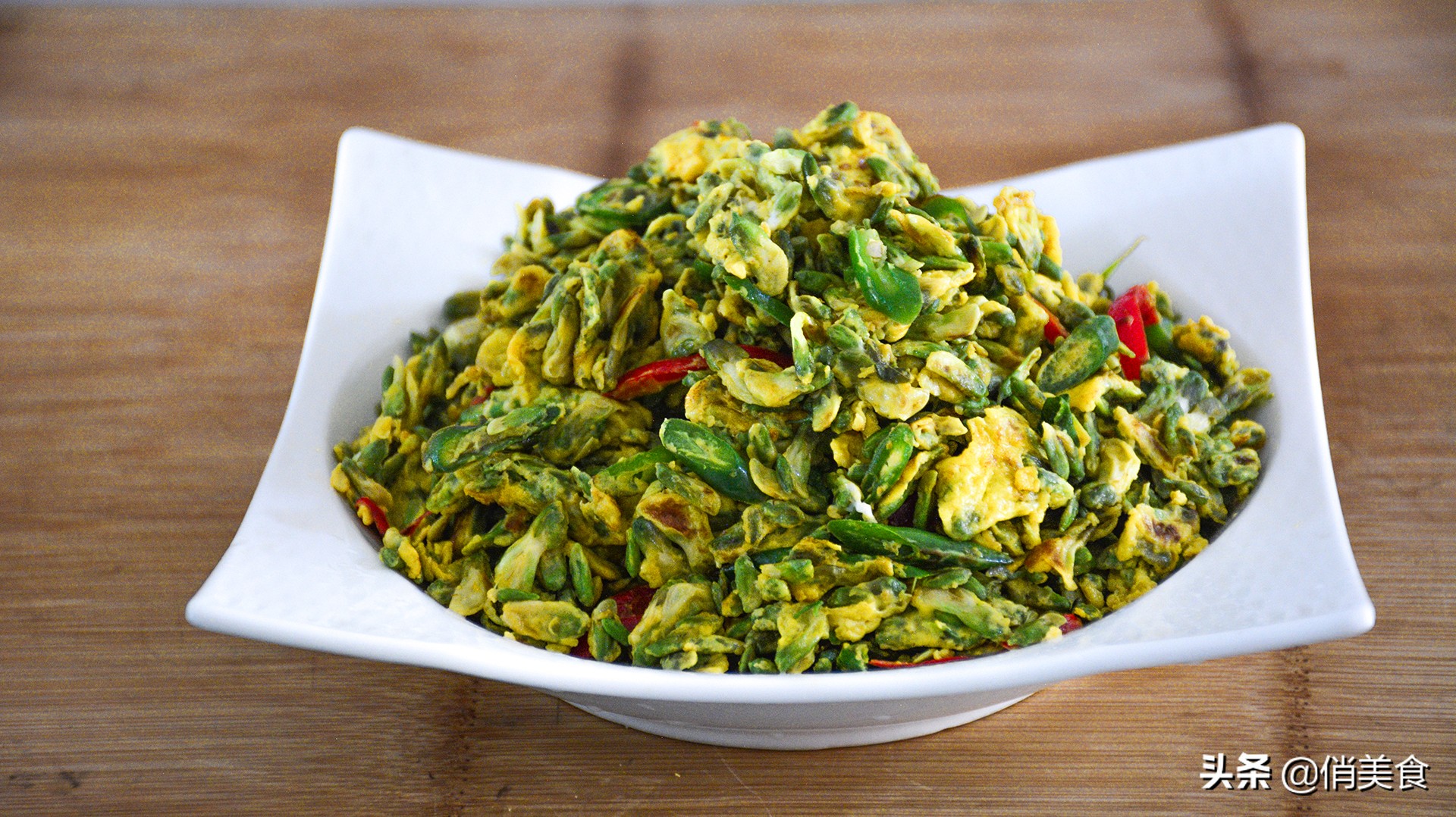 3、锅内油热先下入辣椒翻炒一下,然后把槐花鸡蛋液倒进来,鸡蛋液定型后用铲子翻一下面,槐花熟得非常快,炒至槐花全部定型后快速翻炒均匀就可以出锅装盘啦!