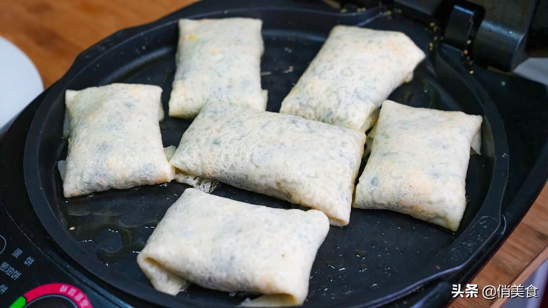 9、然后取一张饼,放入馅料,首先上下折叠,然后再左右折叠,电饼铛刷上一层油先提前预热2分钟,做好的小饼直接放入电饼铛。